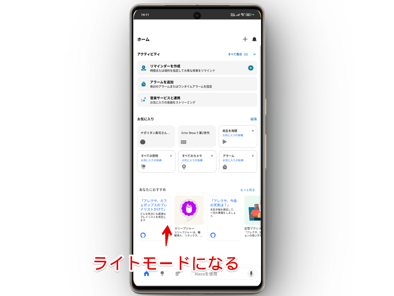 Androidスマホにインストールしたアレクサアプリのデフォルトは、スマホ本体側で設定しているテーマに左右されるようになっています。スマホをダークモードにしているならアプリ側も自動的にダークモードになります。