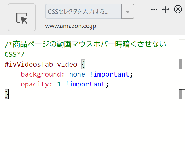 以上、PCウェブサイト版「Amazon」で商品ページの動画をマウスホバーした時、暗くさせないようにするCSSでした。