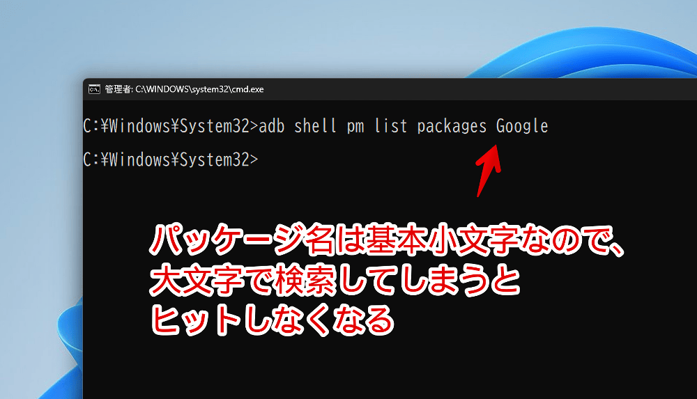 上記コマンドのままだと、大文字小文字が区別されて検索されます。パッケージ名は基本小文字なので、「Google」とかにしちゃうとヒットしなくなります。小文字で検索します。