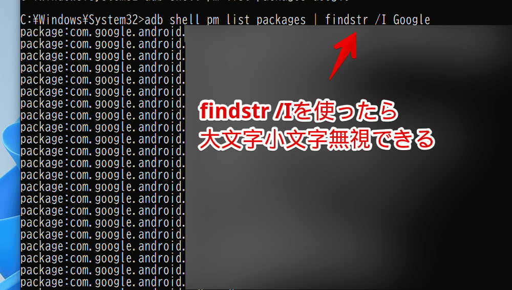 パイプ記号(|)で区切った後、「findstr /I」を書いて検索したいパッケージ名(部分一致でOK)を書くと、大文字小文字を無視できます。大文字で検索しても小文字がヒットします。