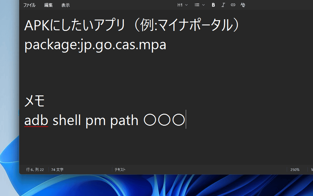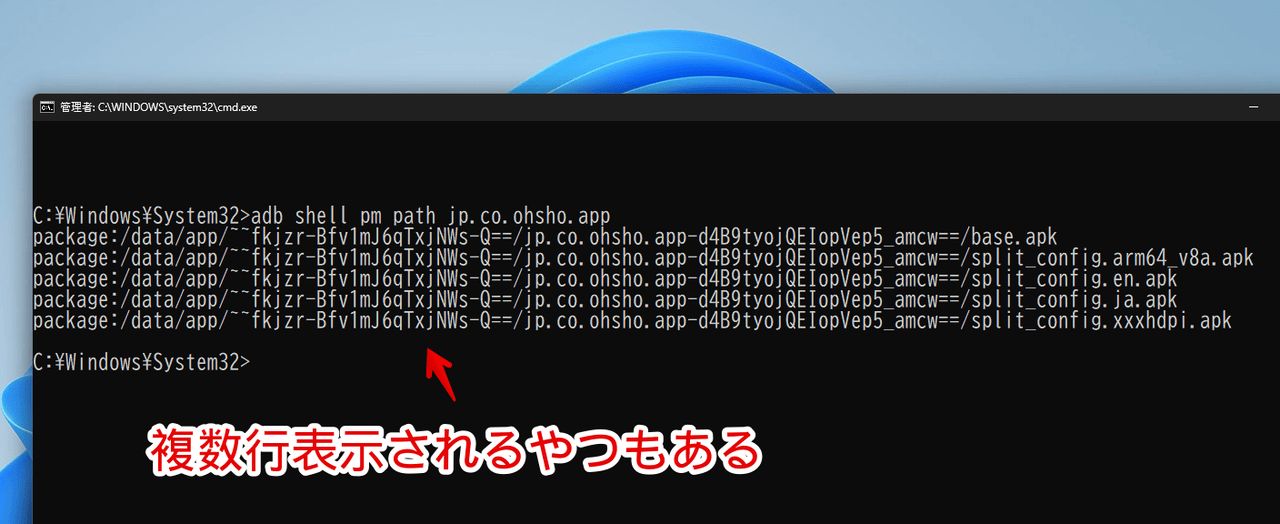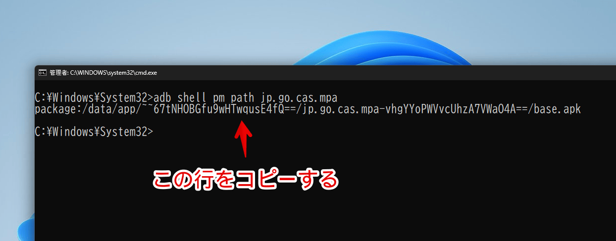 adb pull 〇〇 %USERPROFILE%\myna.apk「〇〇」の部分を「package:」から始まり「base.apk」で終わる行に置き換えます。