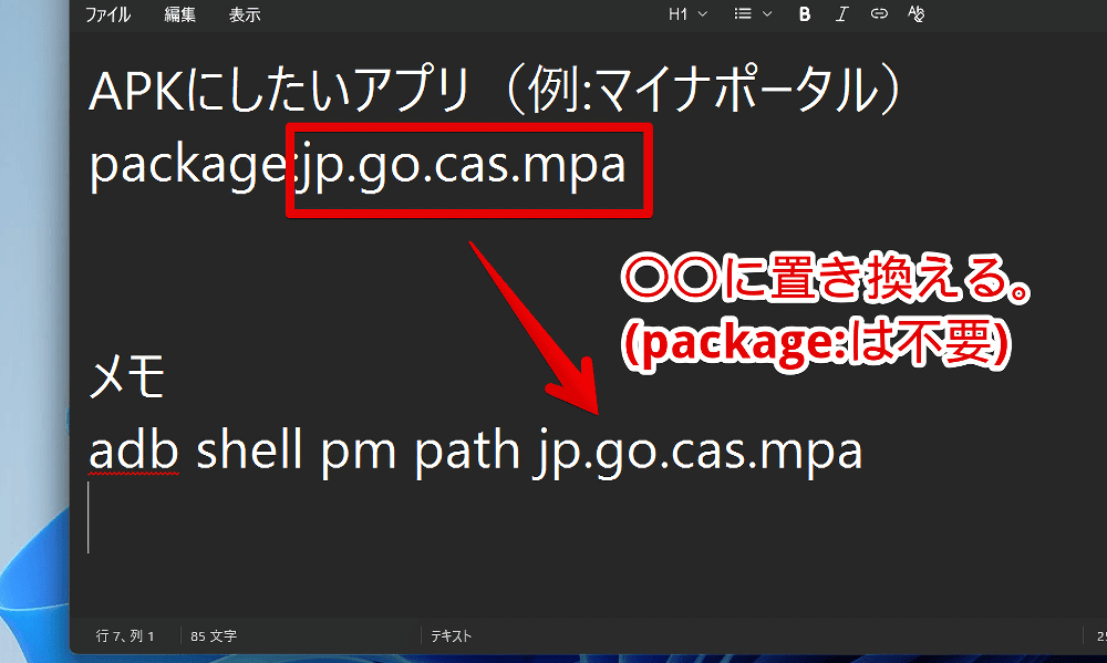 「〇〇〇」の部分を自分がAPKにしたいアプリのパッケージ名に置き換えます。「package:」という文字列は不要です。というかあったらエラーがでます。