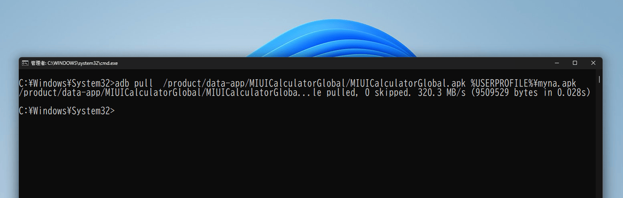 「adb pull 〇〇 %USERPROFILE%\〇〇.apk」の実行