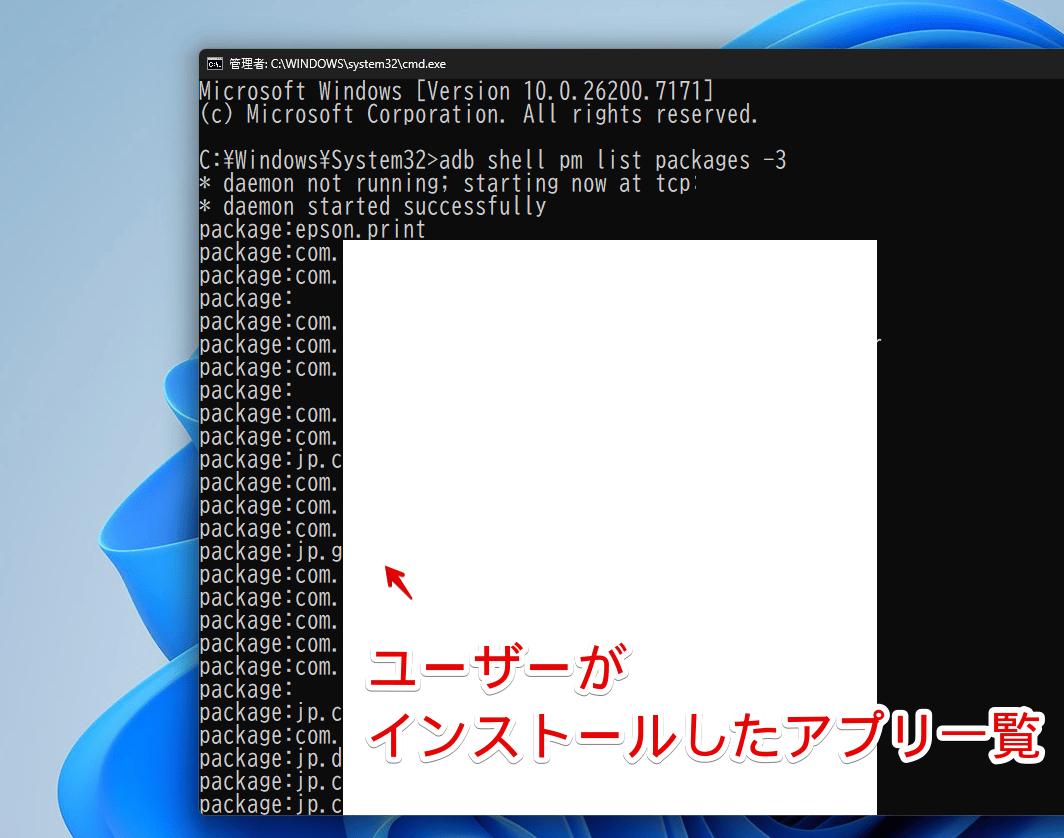 通常、全部のアプリを一覧表示するコマンドは「adb shell pm list packages」コマンドです。ただ、それだとシステムアプリ(プリインストール)まで全部表示してしまい、お目当てのアプリを探すのに苦労します。