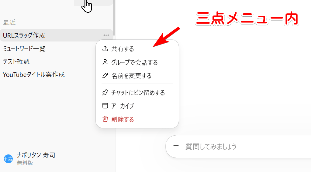 PC版「ChatGPT」の左側サイドバーに表示される作成したチャット一覧にはそれぞれ三点ボタンがあります。クリックすると、以下の項目があるポップアップが表示されます。