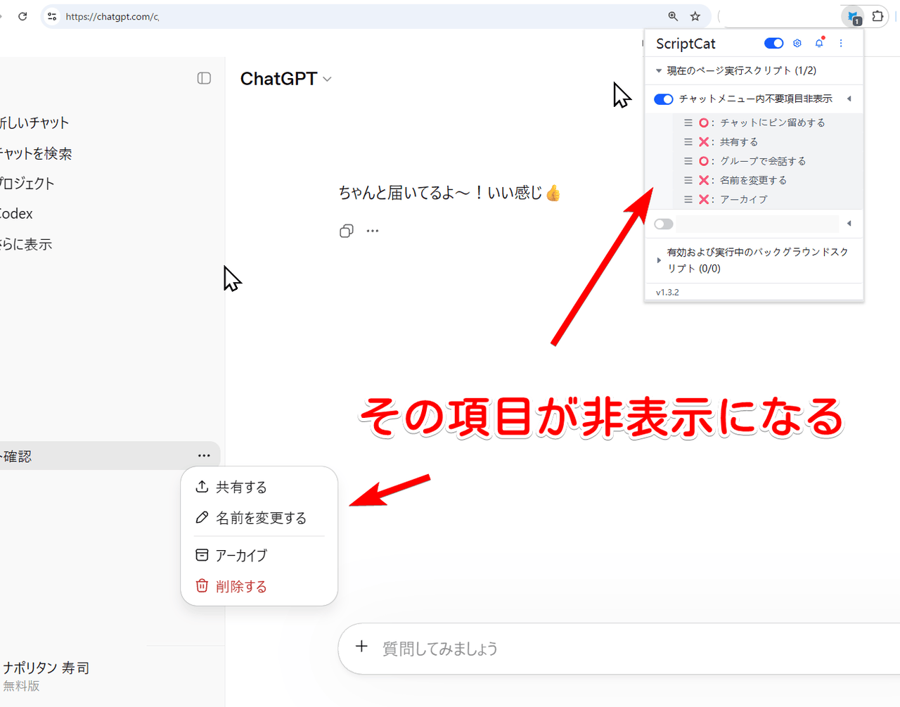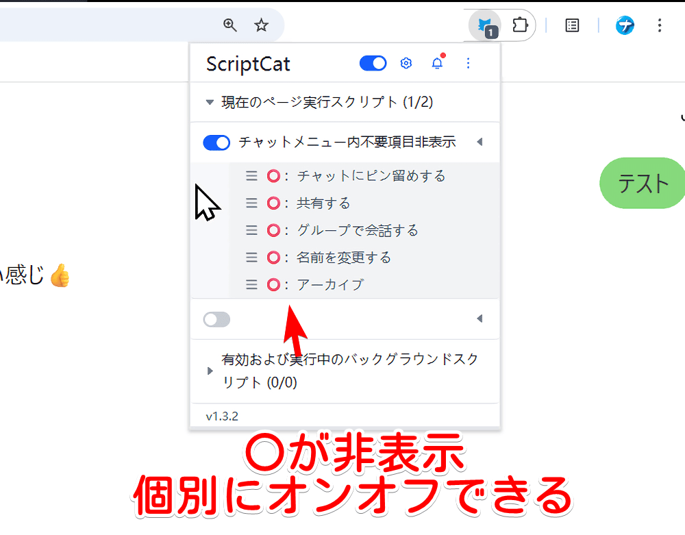 インストールしたスクリプト拡張機能のアイコンをクリックして、「チャットメニュー内不要項目非表示」が有効になっていることを確認します。