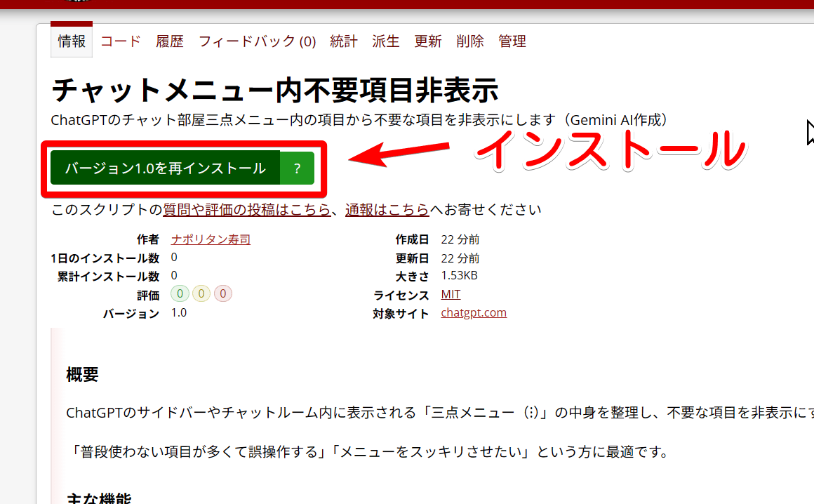 「Violentmonkey」や「Tampermonkey」拡張機能を導入している場合は、自動的にインストール画面が表示されます。「インストール」をクリックします。(下記画像はScriptCat)