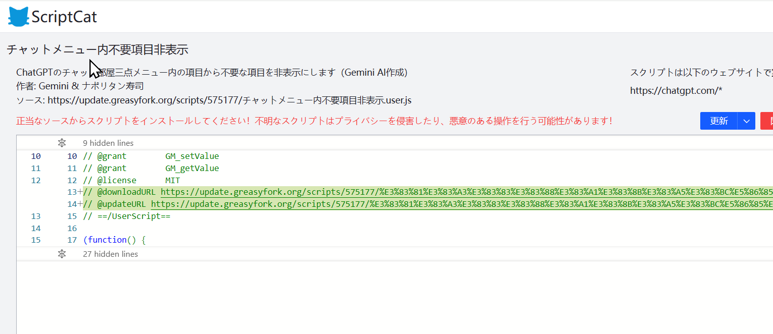 スクリプトをGreasy Fork経由にした理由はずばり自動更新と管理の手間です。もし仕様変更(新しい項目が追加されたり名称変更したり)があった時に僕が修正版を配信することで、読者さんはいちいち修正版コードをコピペしなくても自動更新されるはずです。