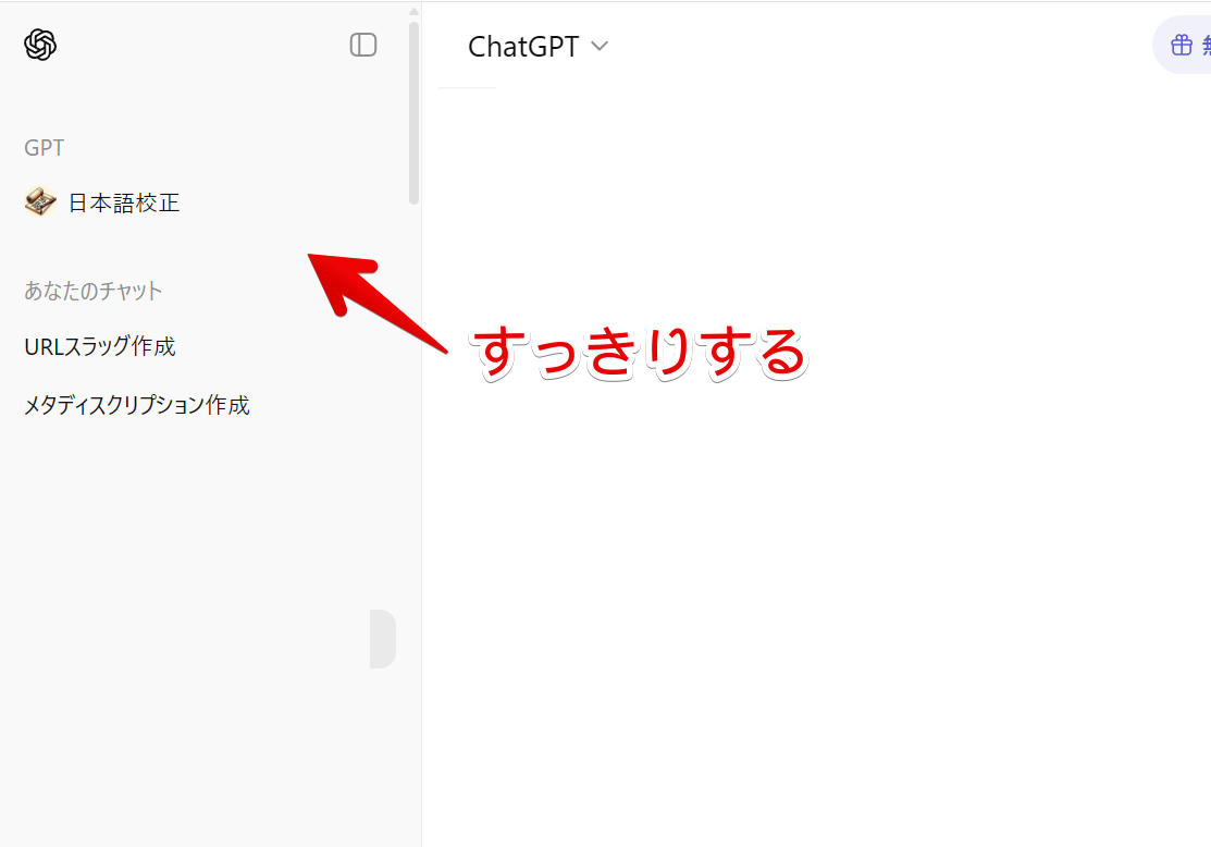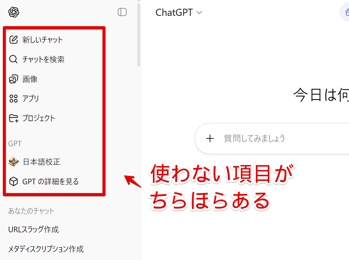 僕のPC版「ChatGPT」の左側サイドバーには以下のような項目が表示されています。
