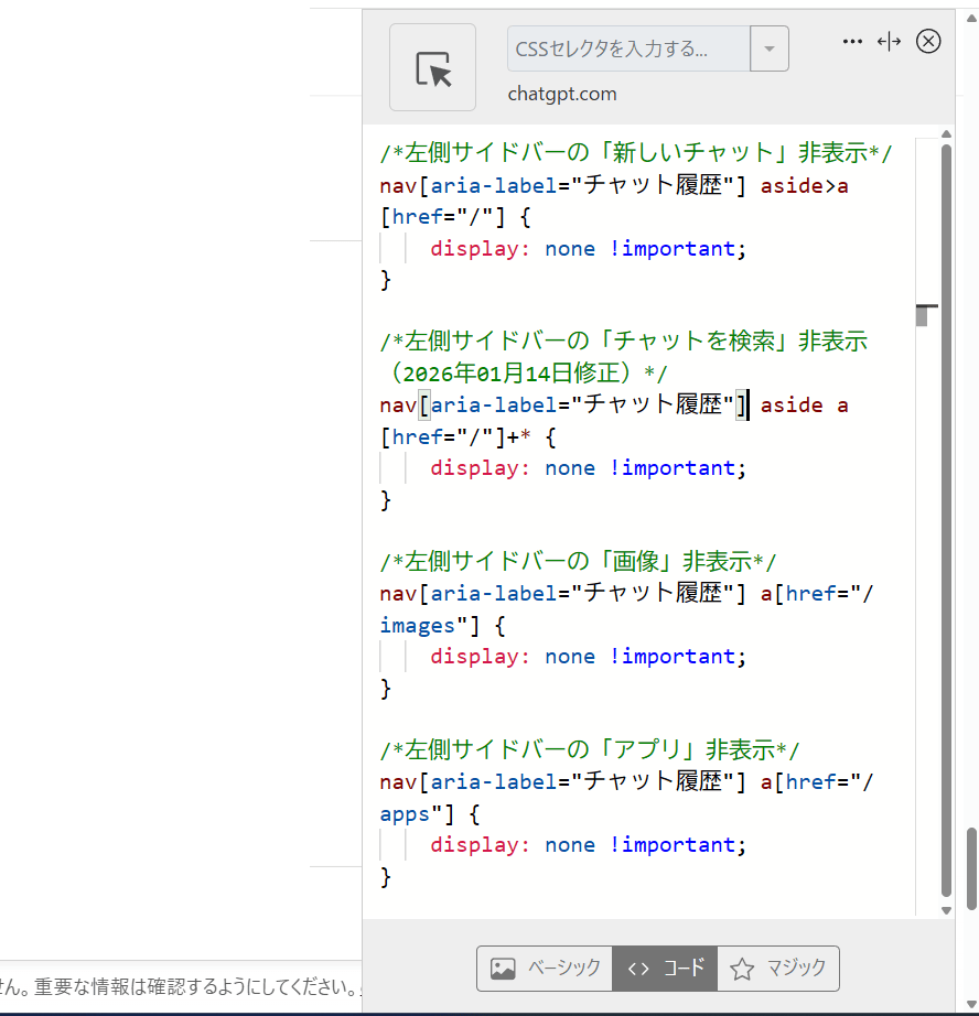 【ChatGPT】左側サイドバーのチャットを検索、アプリ、プロジェクトなど非表示にするCSS