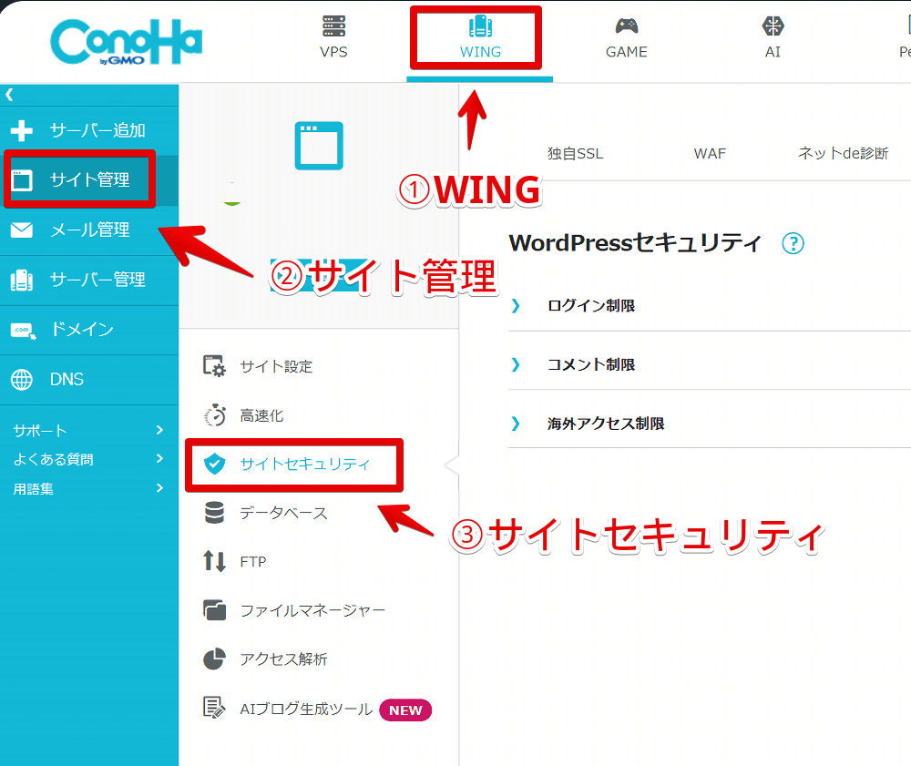 上部の「WING」サーバーを選択します。左側サイドバーの「サイト管理」→「サイトセキュリティ」をクリックします。左下の「サイトマップ」から直接開いてもOKです。