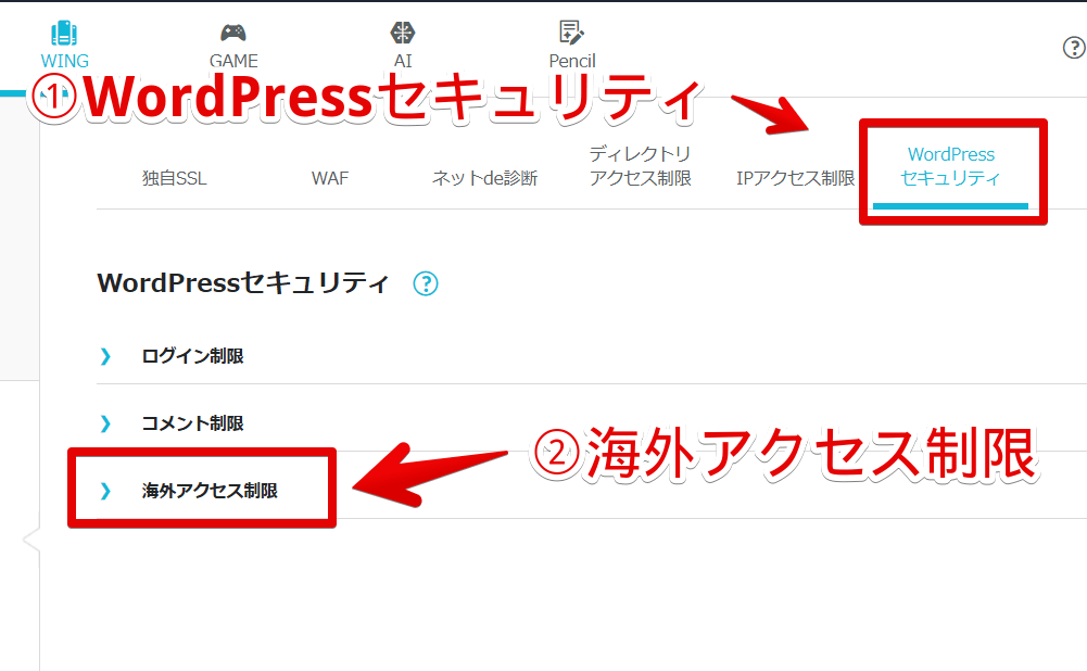 上部にある「WordPressセキュリティ」→「海外アクセス制限」をクリックします。