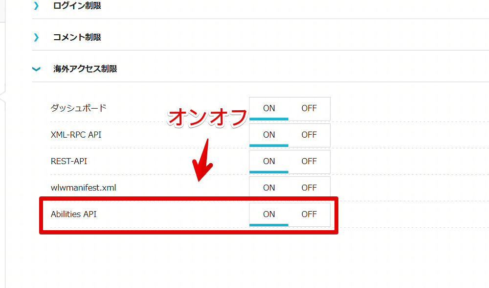 ここに「Abilities API」項目があります。ON、OFF好きなほうを選択します。初期ではONになっています。