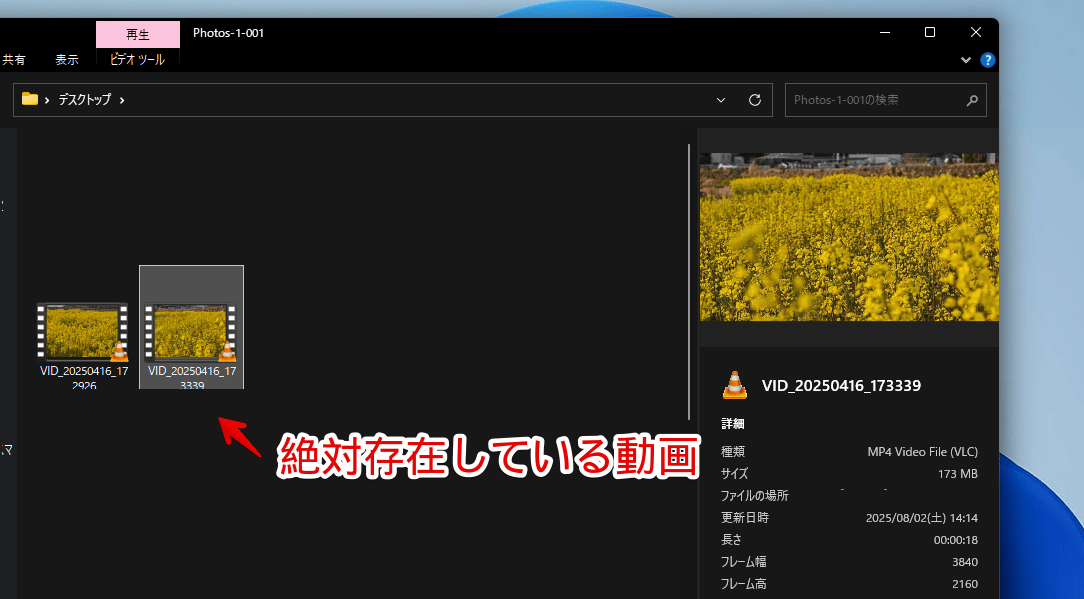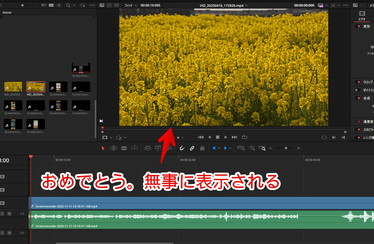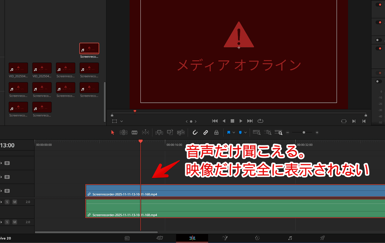 - タイムラインに追加した時、音声は流れる。映像だけ流れない