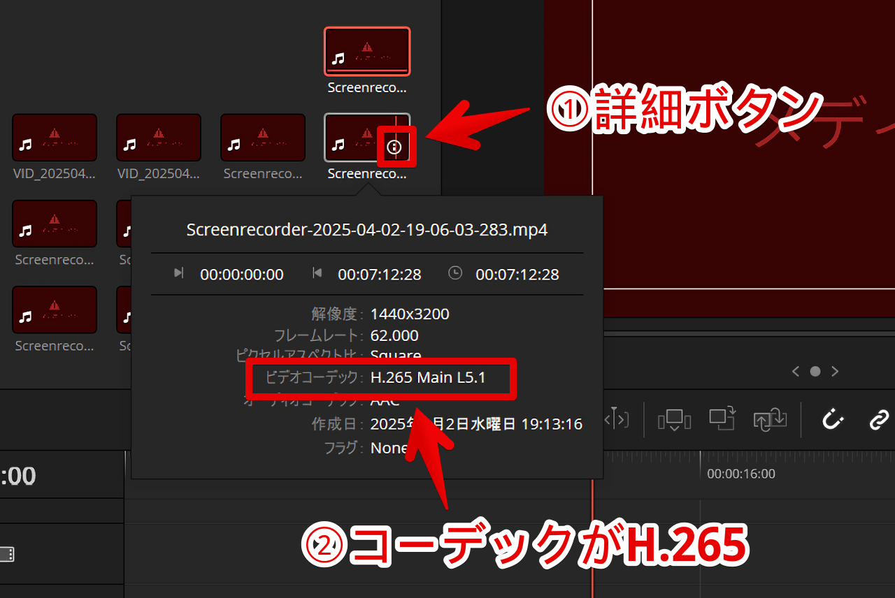 なので、そもそも「H.265(HEVC)」形式にしないようにする、あるいは何かしらの変換ソフトでH.264にすることでも対処可能ですが、個人的には、DaVinci Resolveで扱うためだけに古い規格(H.264)にするのはおすすめしません。