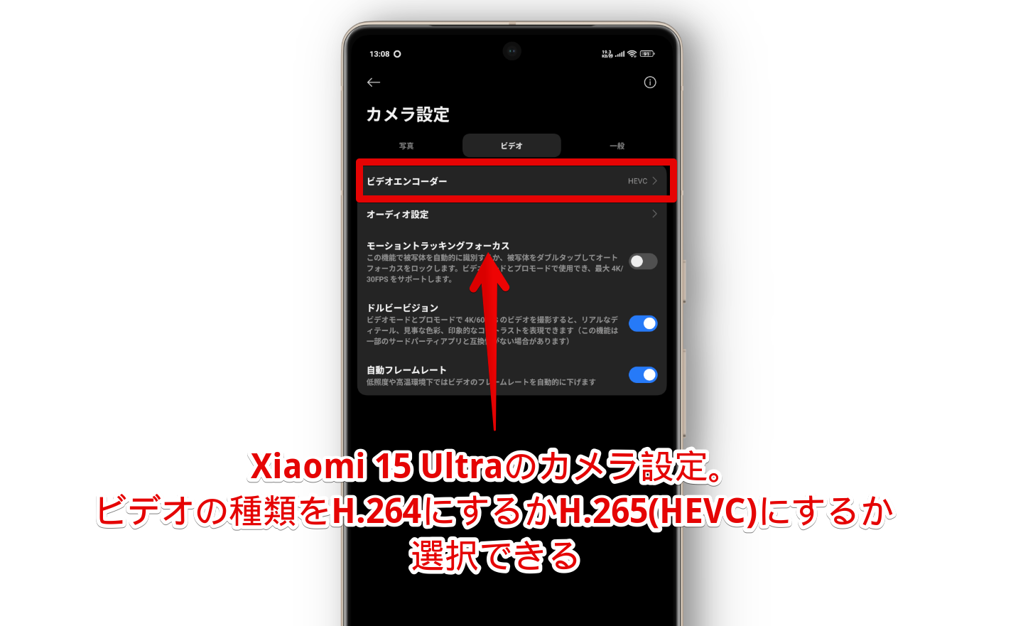 撮影したカメラ・スマホによっては「H.264」にするか「H.265(HEVC)」にするか設定できる場合があります。下記画像はXiaomi 15 Ultraです。