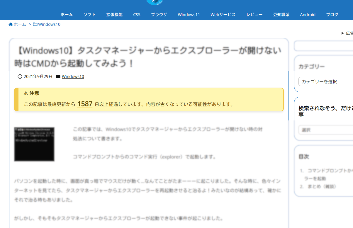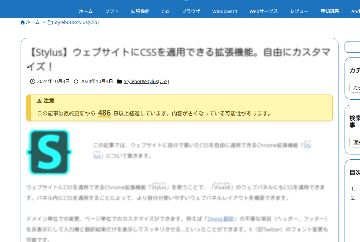 }以下のように更新日が古い記事のタイトル下に黄色背景のメッセージが表示されます。