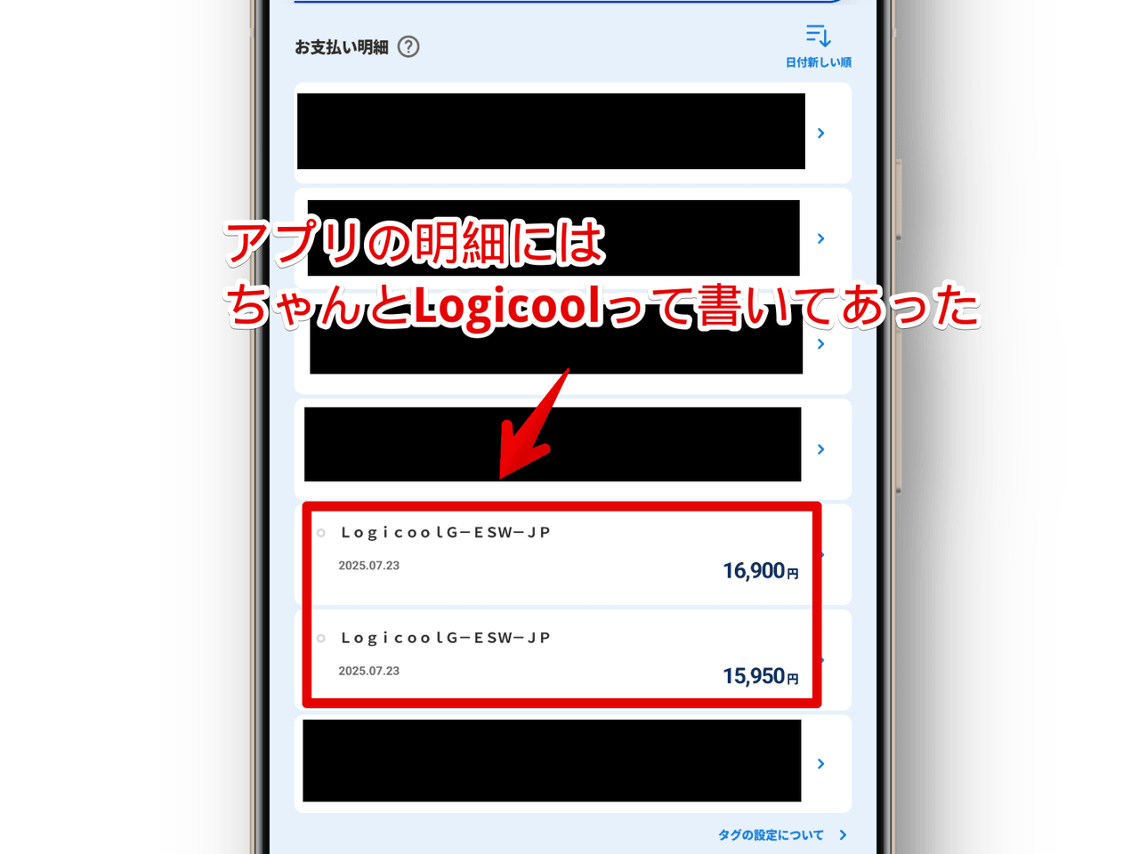 というか「JCB W」に登録しているメールアドレスに届く速報版では、ご利用先が「イ-エスダブリユ-ジヤパン」になっていましたが、確定した後のお支払い明細には「Logicool ESW-JP」と書いてありました。