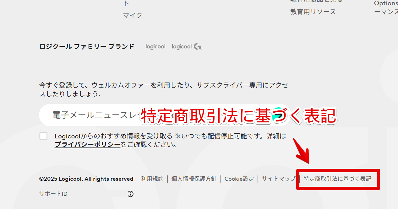Logicoolの公式サイトにアクセスして、ページの一番下までスクロールします。フッターにある「特定商取引法に基づく表記」をクリックします。
