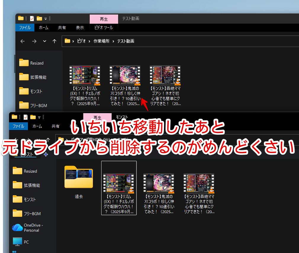 いちいちドラッグ&ドロップした後に元の場所から削除する手間が発生します。