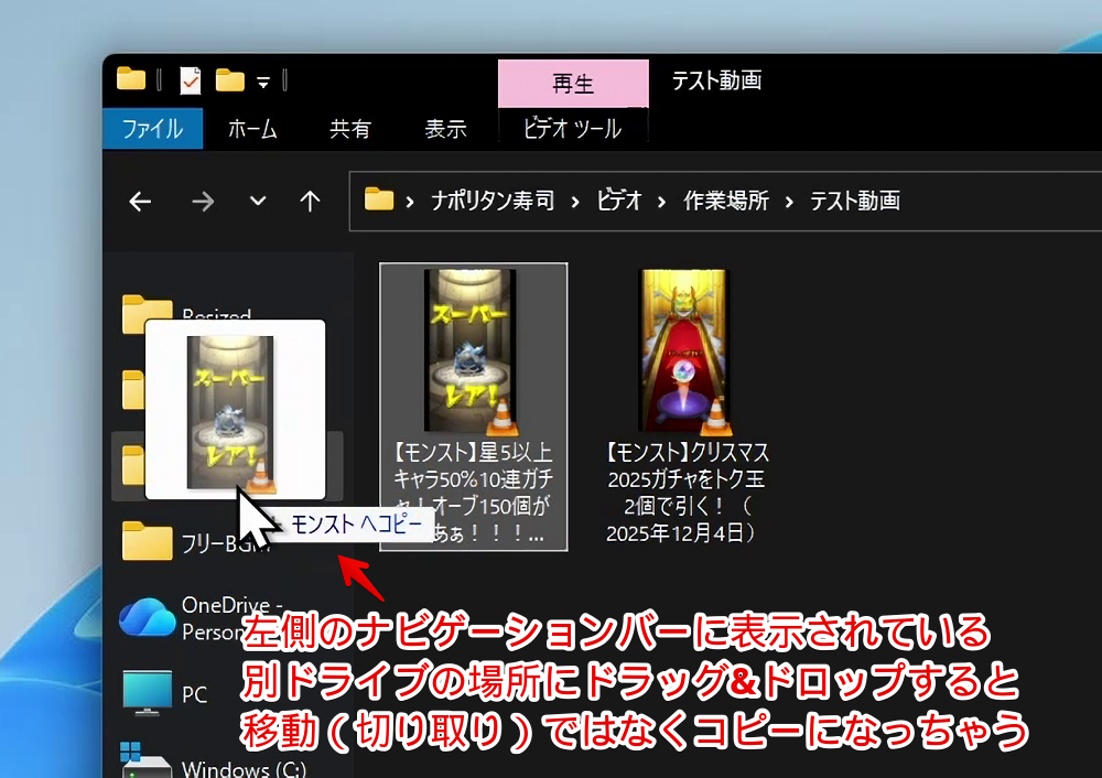 Windows11のエクスプローラー左側にあるナビゲーションウィンドウにファイルをドラッグ&ドロップした時、ドラッグ&ドロップした先が別ドライブ(別のHDDや別のSSDなど)だった場合、移動(切り取り)ではなくコピーになってしまいます。