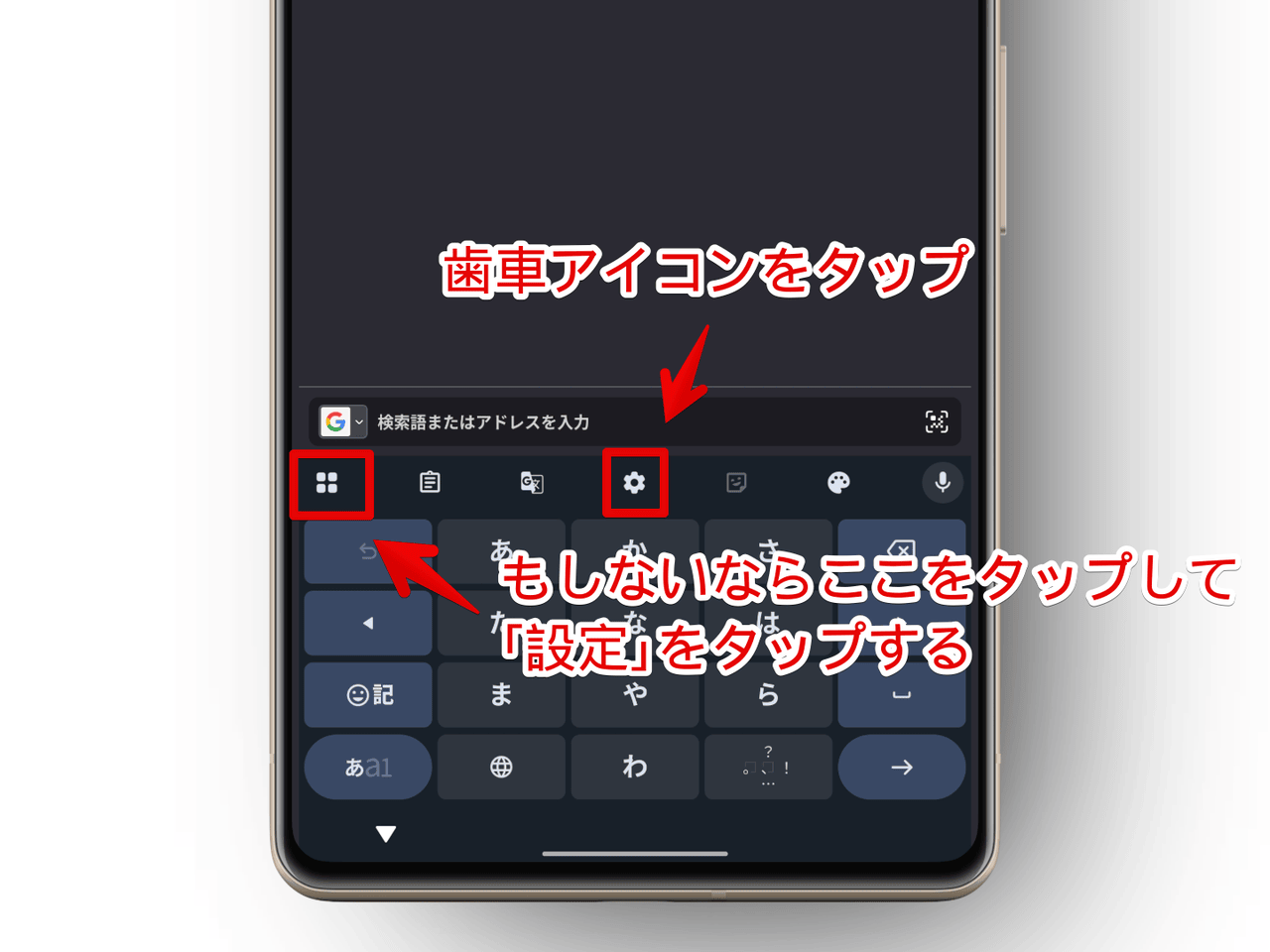 - ツールバー内にある歯車アイコンをタップして設定を開く(ない場合は全てのツールを表示するボタン→設定をタップ)