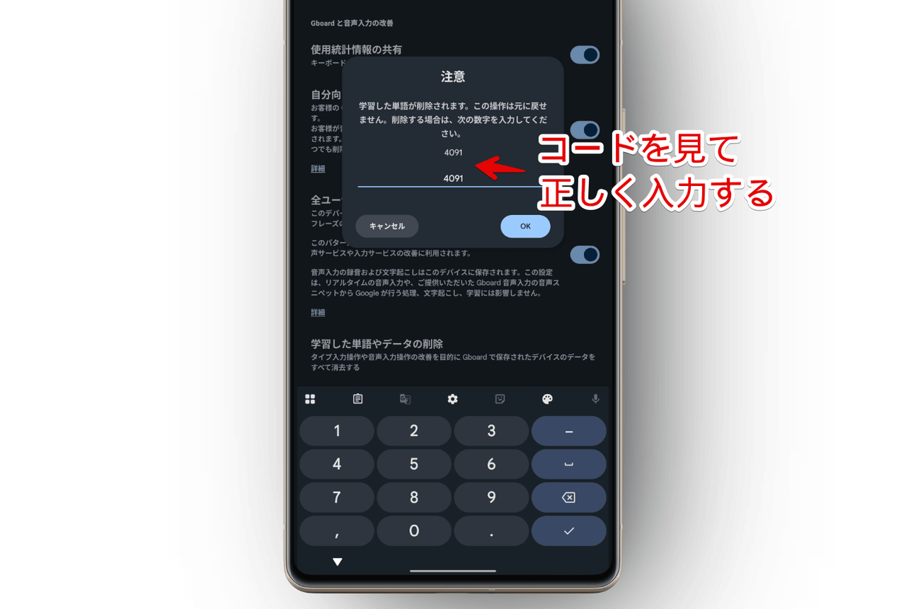 数字を正しく入力した状態で「OK」をタップすると、予測候補が全削除されます。「消去しました」と表示されます。