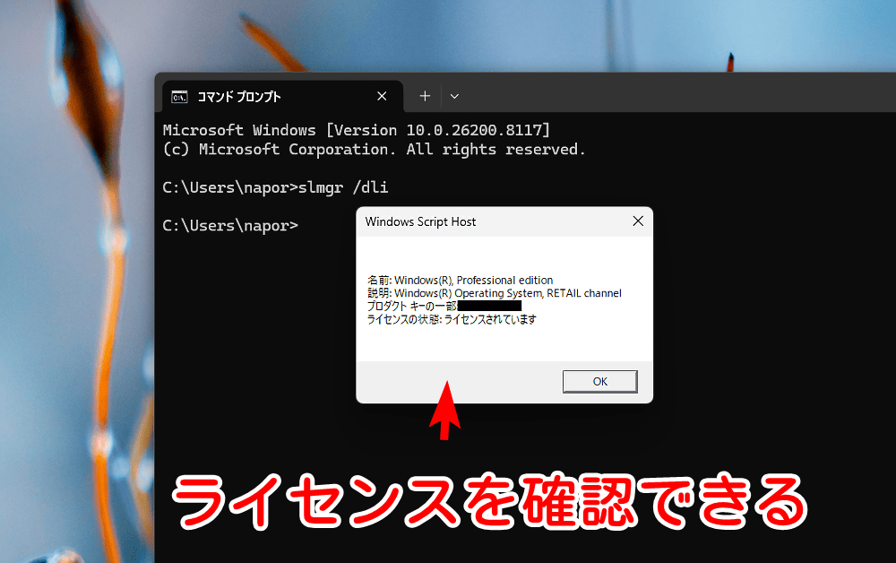 コマンドプロンプトを起動して「slmgr /dli」です。
