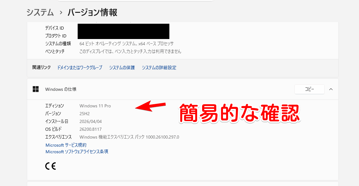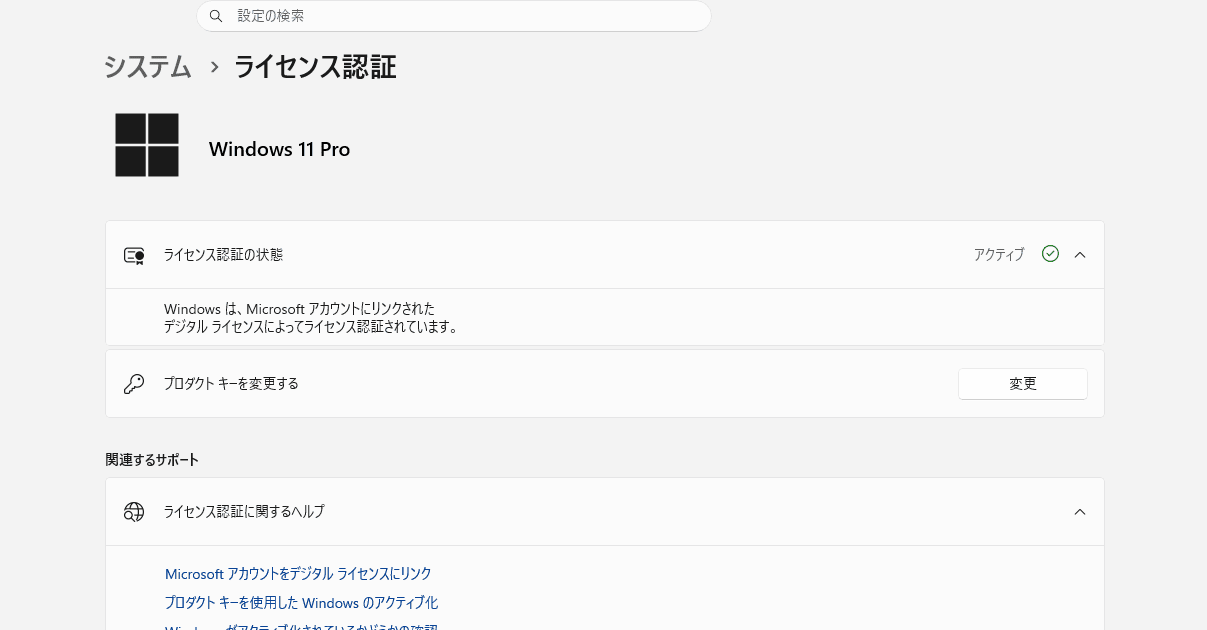 Windows11の設定→システム→バージョン情報→関連内にある「プロダクトキーとライセンス認証」からも簡易的にはチェックできます。