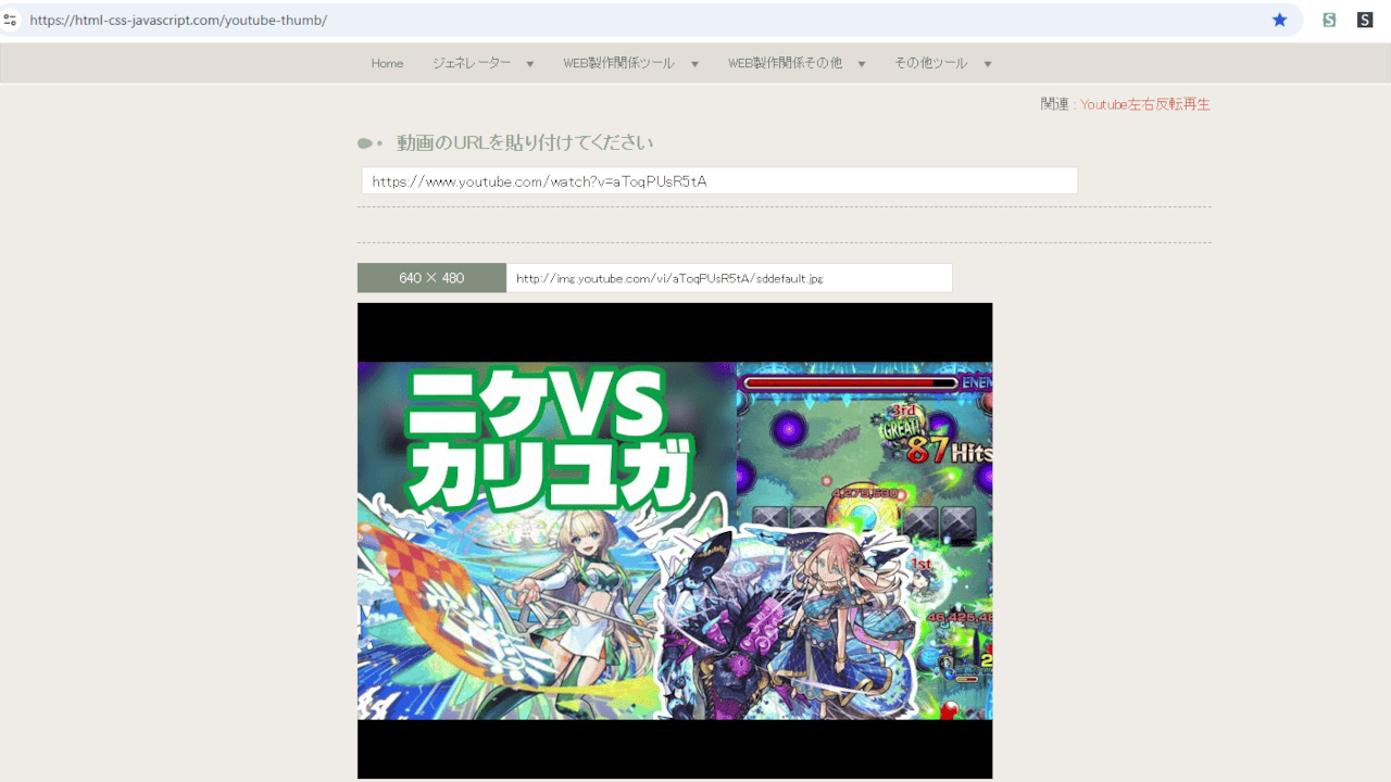 取得したい動画のURLを入力することで瞬時にサムネイル画像が表示されます。異なるサイズのサムネイルが登録されている場合は全てのサイズが表示されます。