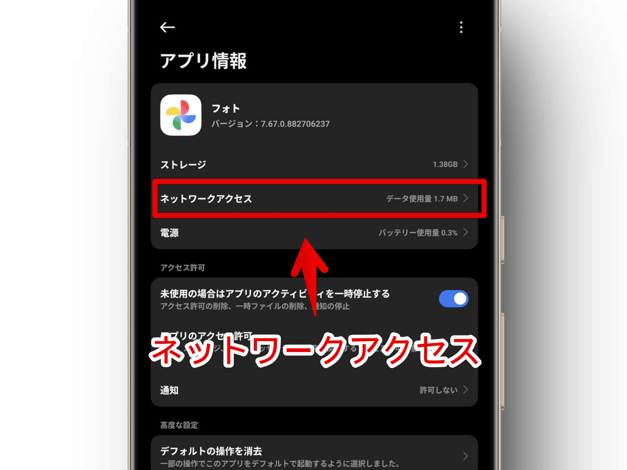 XiaomiでGoogleフォトのネットワークアクセスを開く手順画像