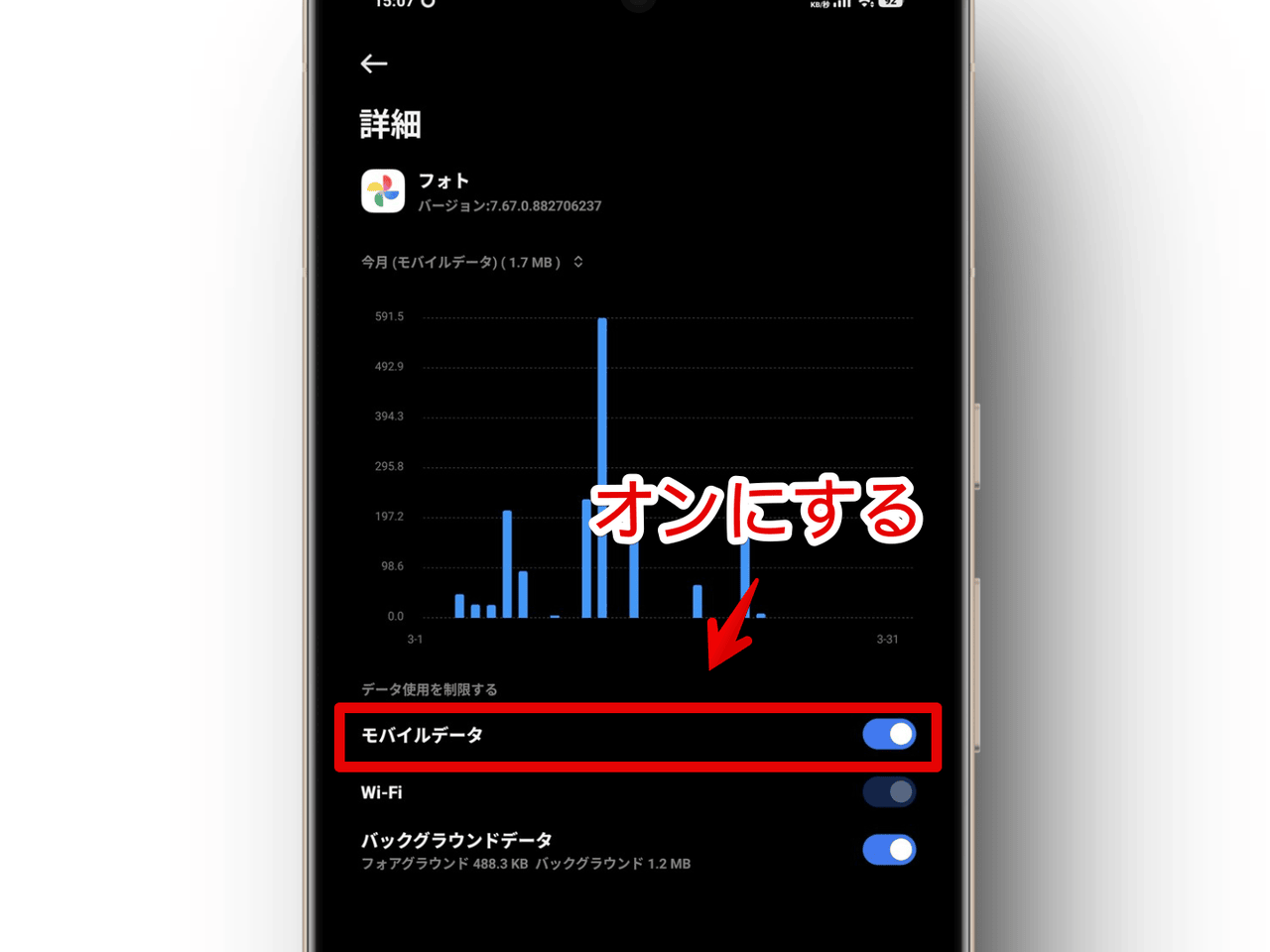 「Wi-Fiは許可してるから問題ないな(ってかGoogleフォトのWi-Fiはグレーアウトしてそもそもオンオフできない)。モバイルデータは使ってほしくないからオフにしておこう」と思いオフにしていたんですが、どうやらダメみたいです。