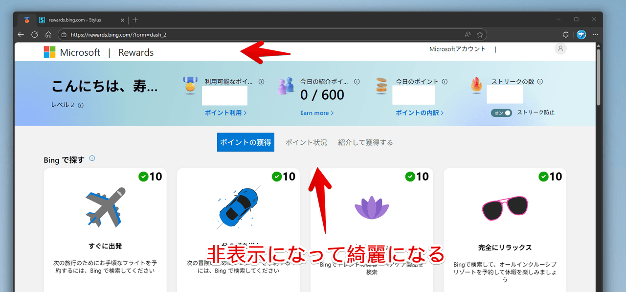 【Microsoft Rewards】上部ヘッダーの懸賞、寄付、抽選に応募の非表示CSS