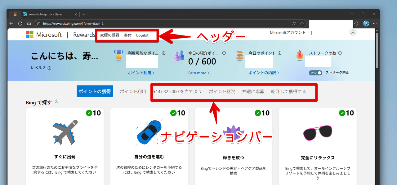 PCウェブサイト版「Microsoft Rewards」のヘッダーとナビゲーションバーには以下のような項目があります。