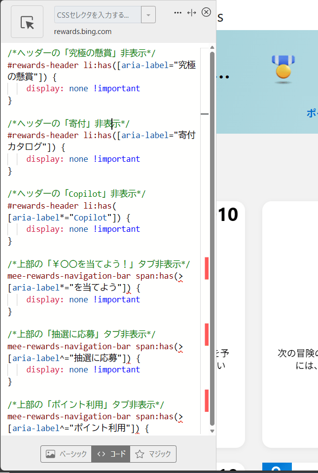 以上、PCウェブサイト版「Microsoft Rewards」のヘッダーとナビゲーションバー内にある不要な項目を非表示にするCSSでした。