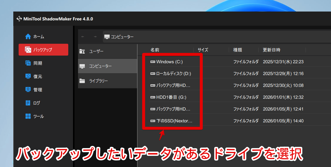 ドライブが破損した時にバックアップしている場所が一緒だと、両方壊れている可能性があるためです。CドライブならDドライブへ、DドライブならEドライブへ…といった感じです。
