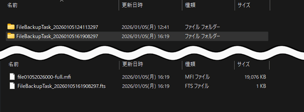 フォルダーが作成されていて、その中に本ソフト専用の拡張子「mfi」でファイルが保存されていました。暗号化・かつ圧縮されているので、本ソフト以外では復元できないようになっています。