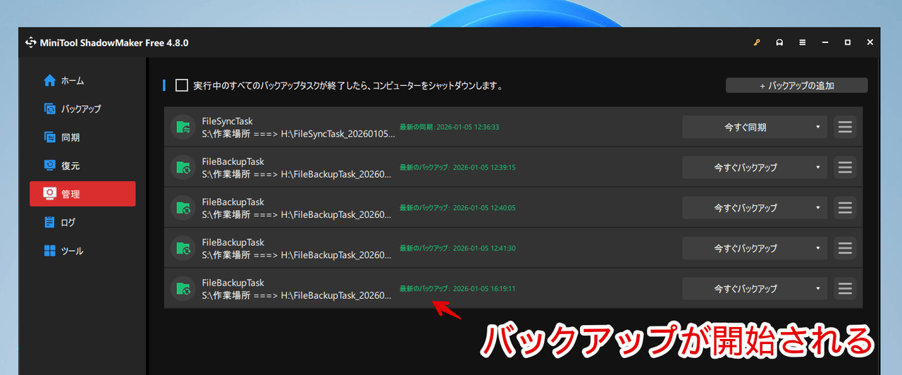 左側サイドバーの「管理」をクリックすることで、これまで実行したバックアップ・同期状況のタスクを確認できます。