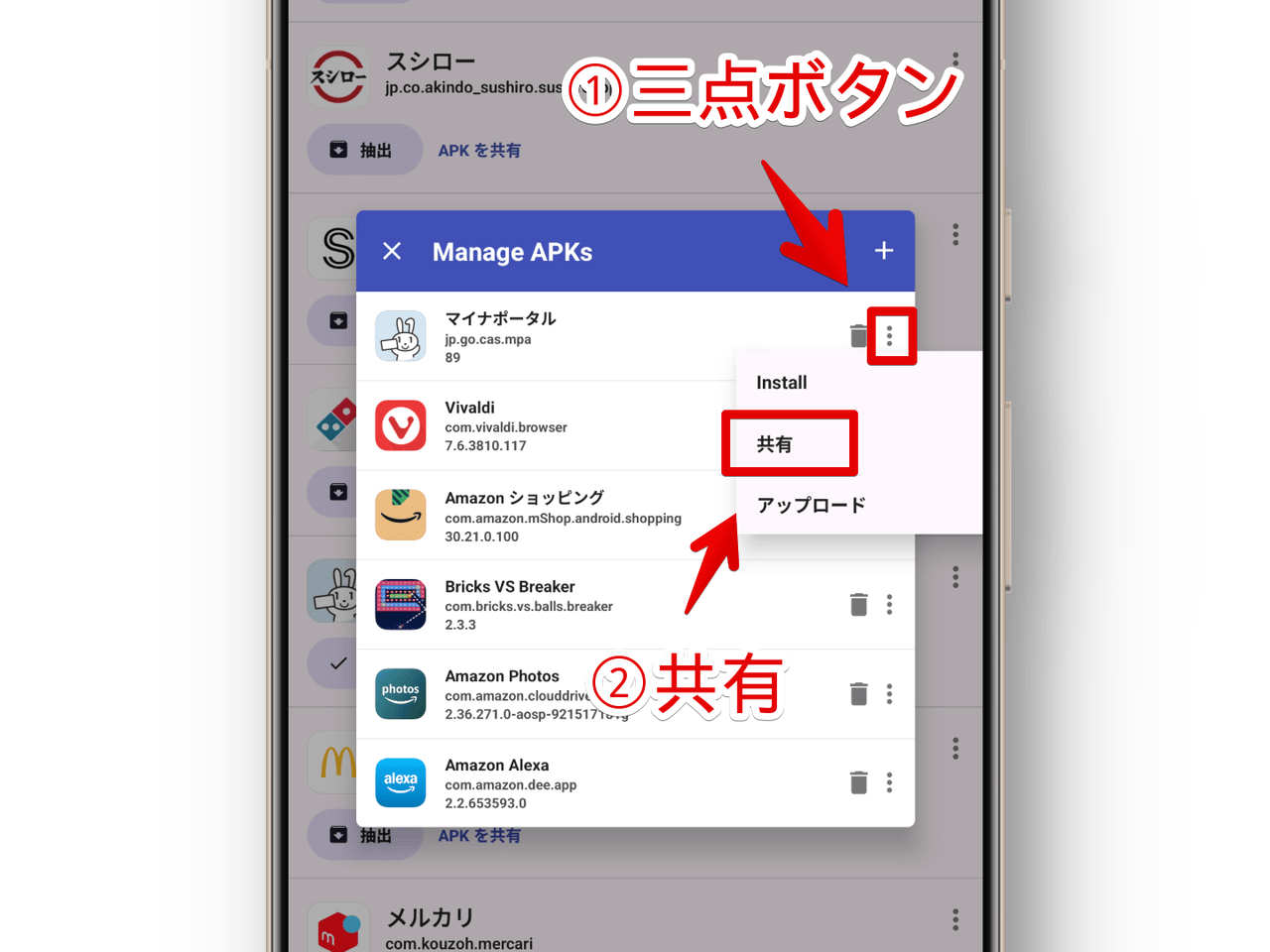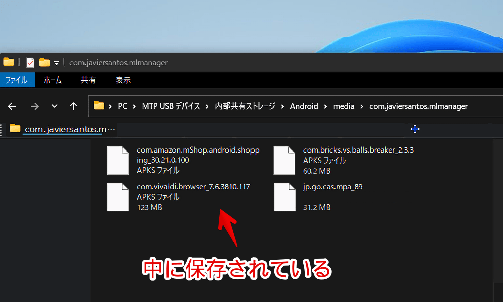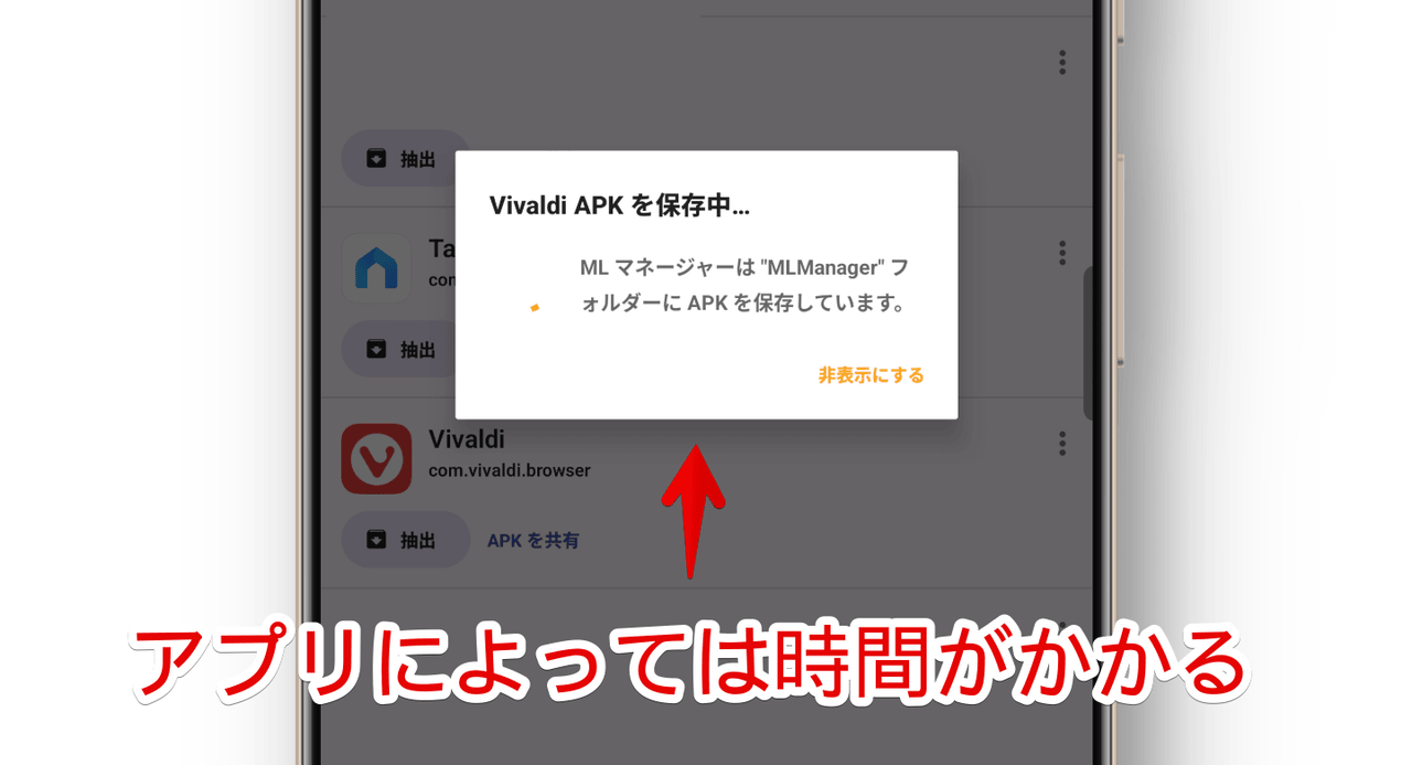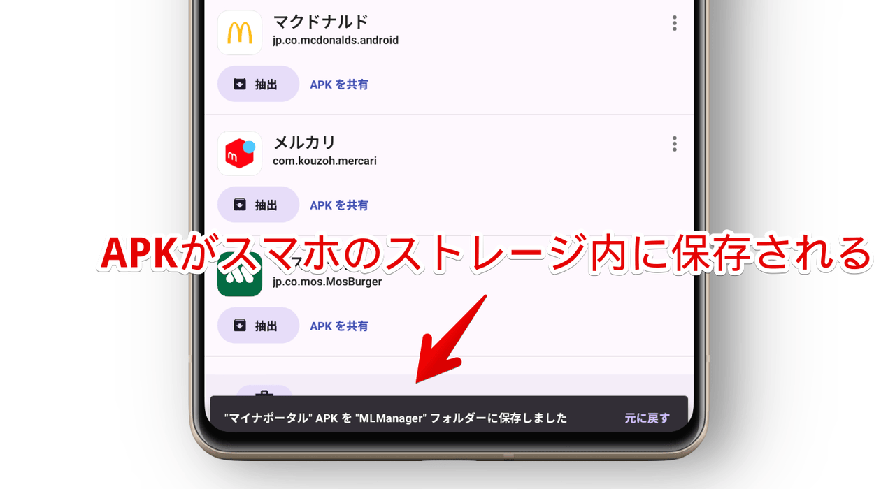 デバイスや使っているアプリなどの環境に左右されるので、もし見れない場合は「ML Manager: APK Extractor」内の共有機能を使って送るのがいいかと思います。