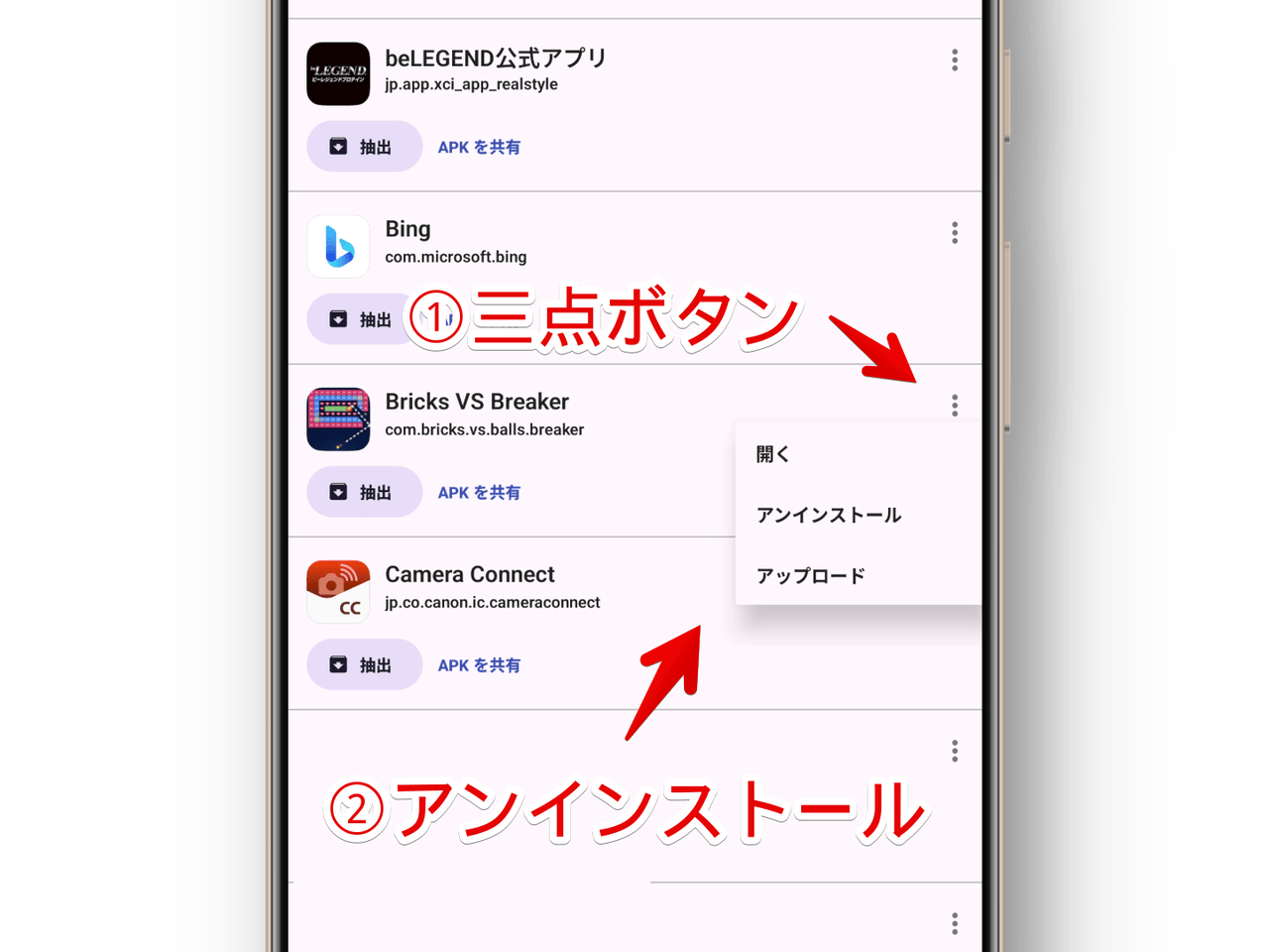 消したいアプリの右横にある三点ボタン(⋮)をタップ→「アンインストール」をタップします。