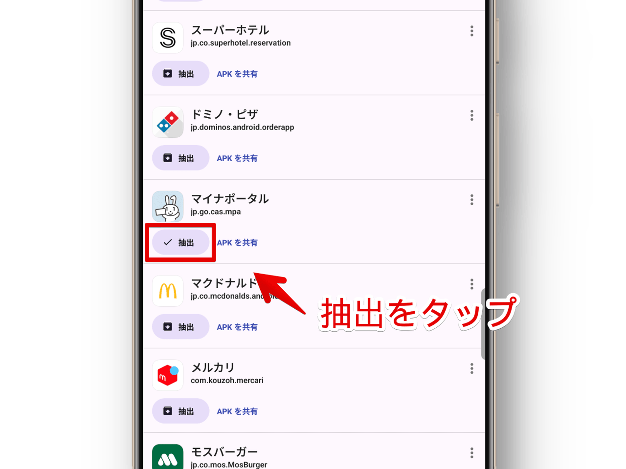 抽出したいアプリを探して、「抽出」ボタンをタップします。