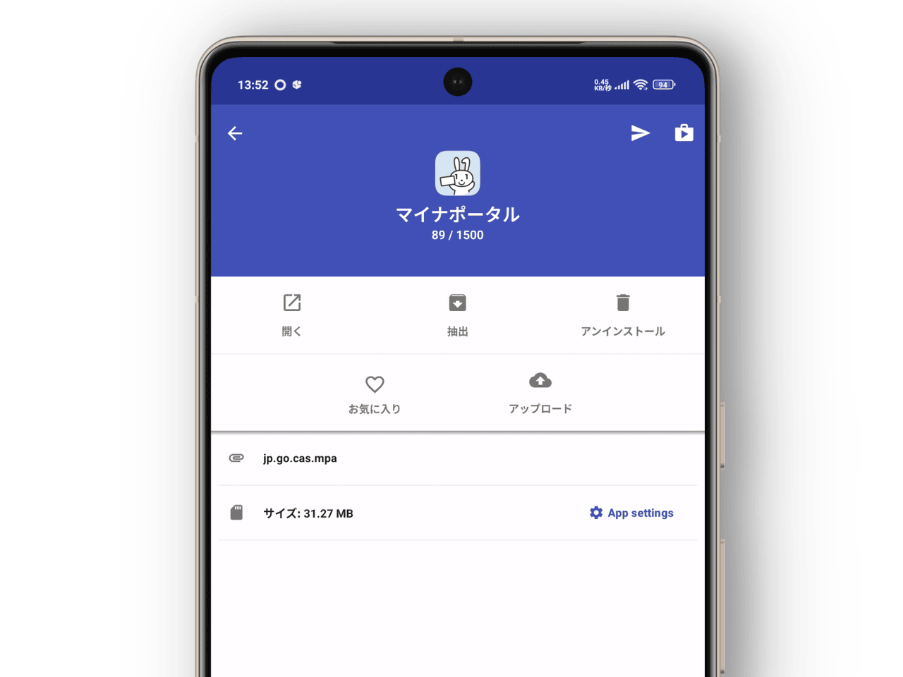 アプリの抽出が開始されます。お試しでやってみた「マイナポータル」だと一瞬で完了しました。
