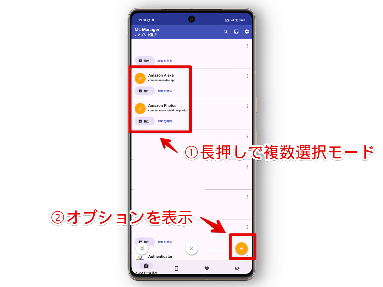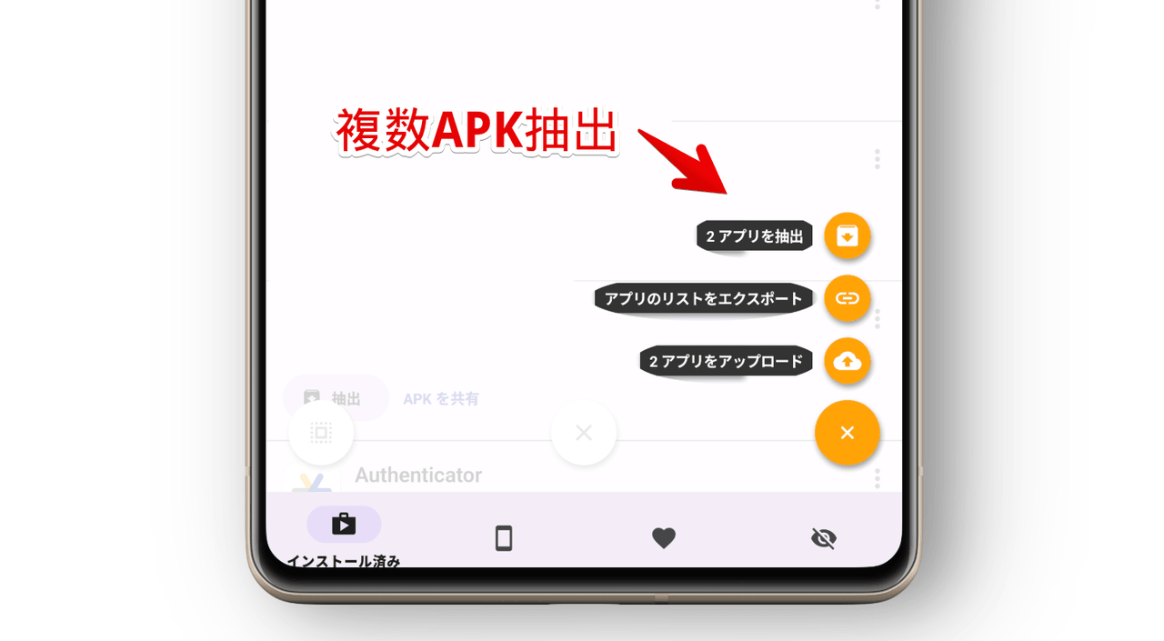 複数アプリを一括で抽出したい場合は長押しで選択モードにします。抽出したいアプリをそれぞれタップします。「