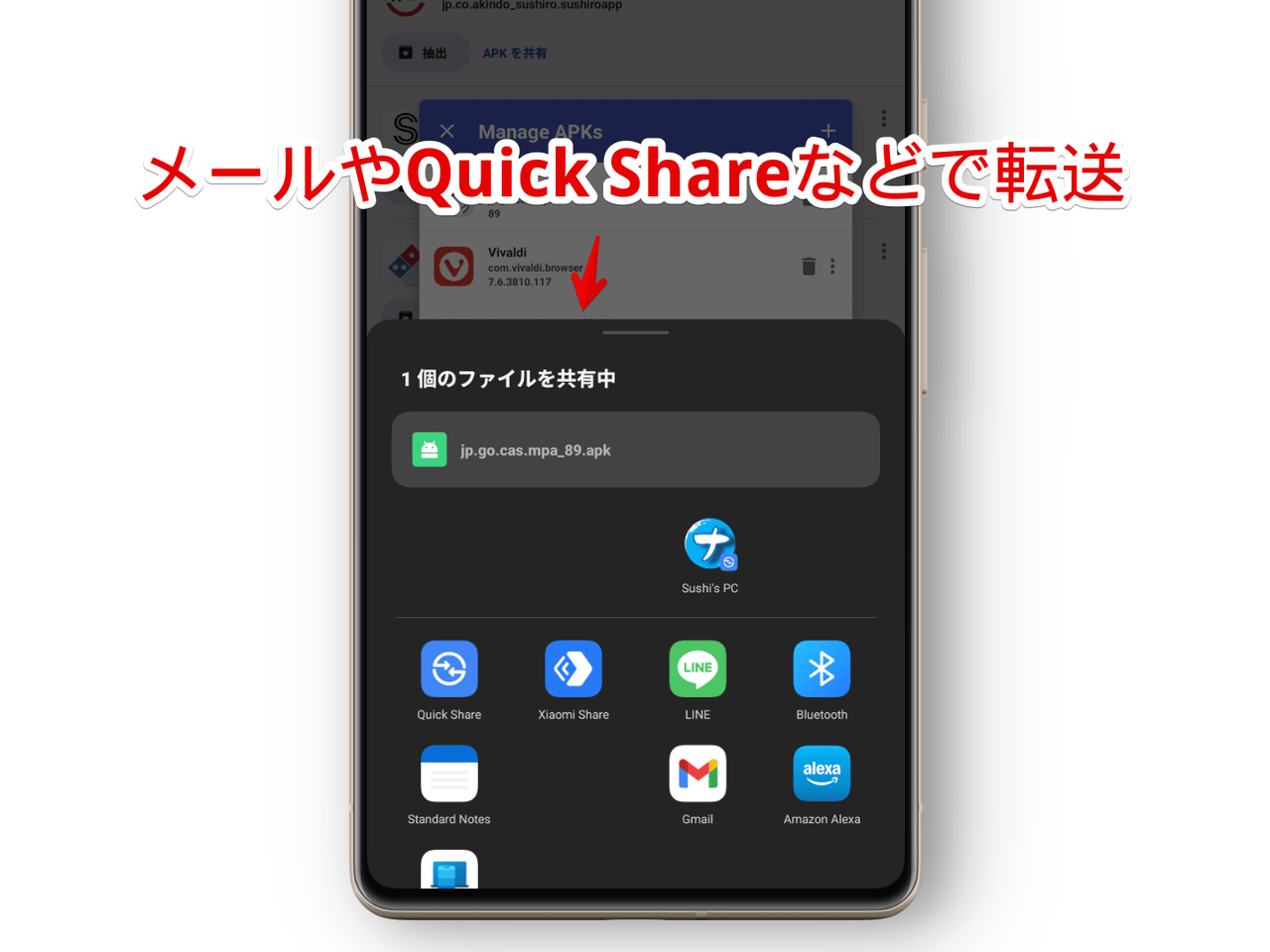 共有ポップアップが表示されるので、好きな手段で別デバイスに送ります。LINEはAPKファイルを送れないと思うので、メールや、AndroidかWindows11相手ならQuick Shareあたりがいいかなと思います。