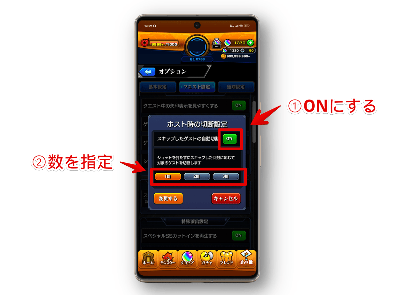 その他→オプション→クエスト設定→「ホスト時の切断設定」の「変更」→「ON」にして回数を指定します。