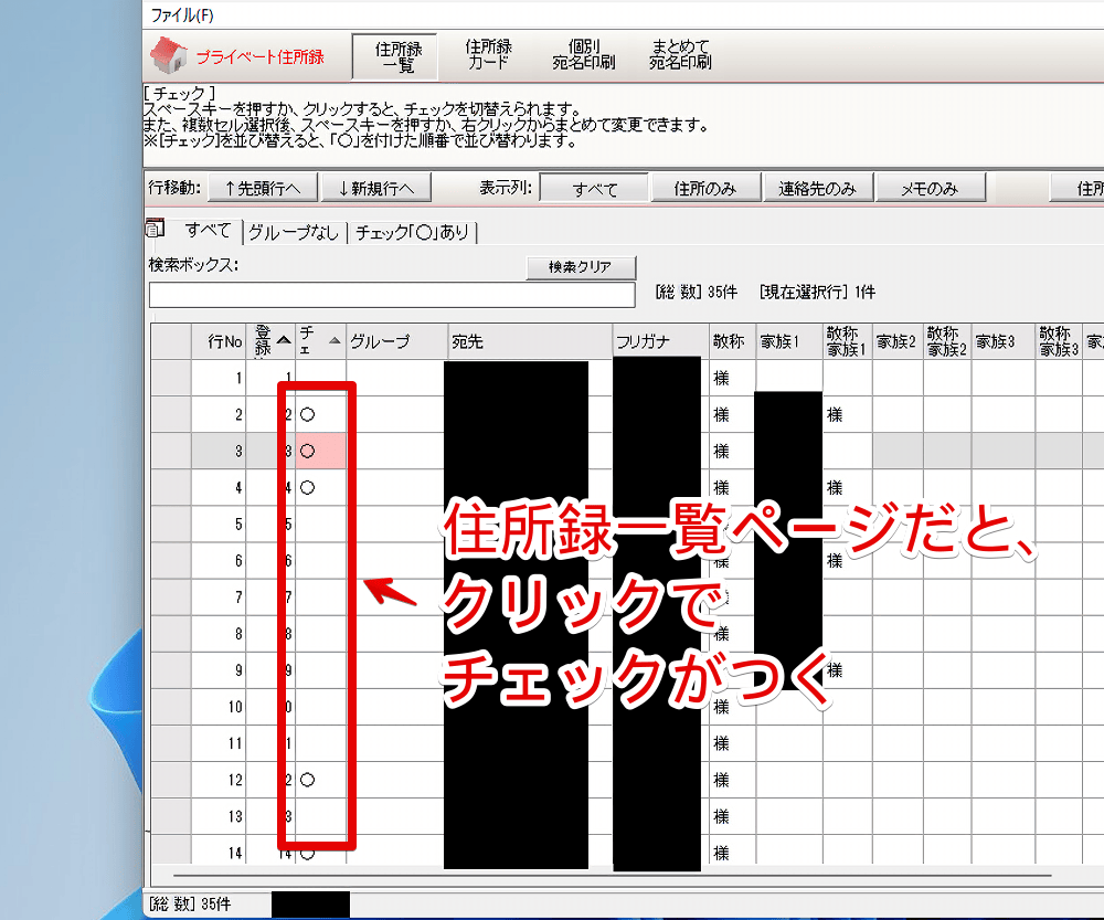 チェックを入れたい住所録のチェック欄をマウスで左クリックします。一回クリックするだけで無事に「〇」がつきます。