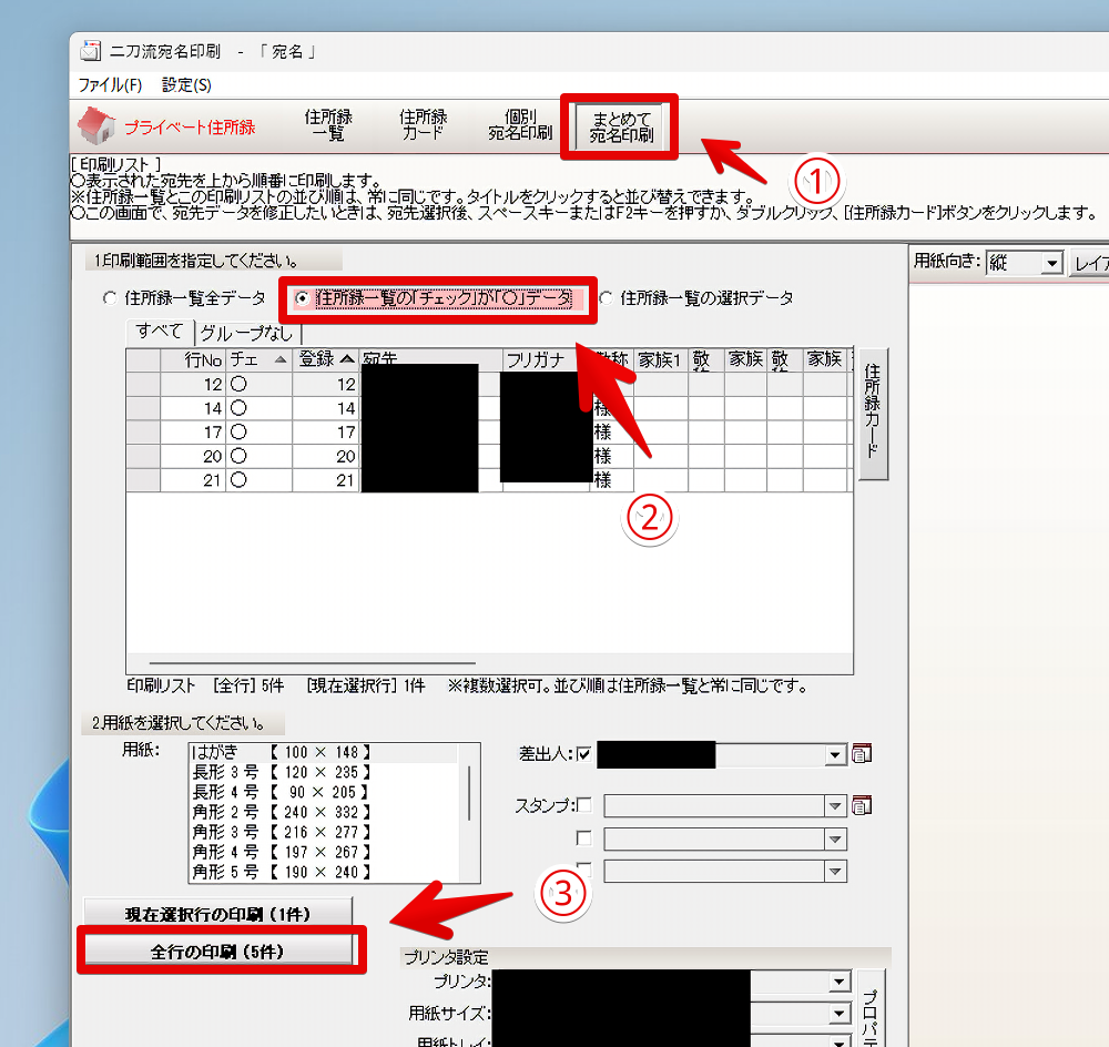 以上、Windows11にインストールした「二刀流宛名印刷」ソフトでチェック(〇)をつけた宛名行だけまとめて印刷する方法でした。