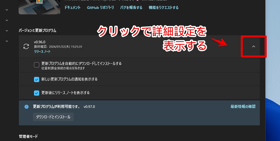 Windows11の「PowerToys」でバージョンに関する詳細設定を開く手順画像