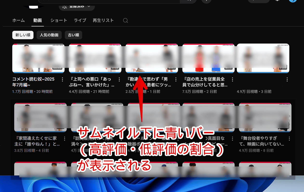 本拡張機能を導入すると、「YouTube」のサムネイル下部に青と灰色の高評価率のバーが表示されます。青いバーが高評価、灰色のバーが低評価の割合になっています。