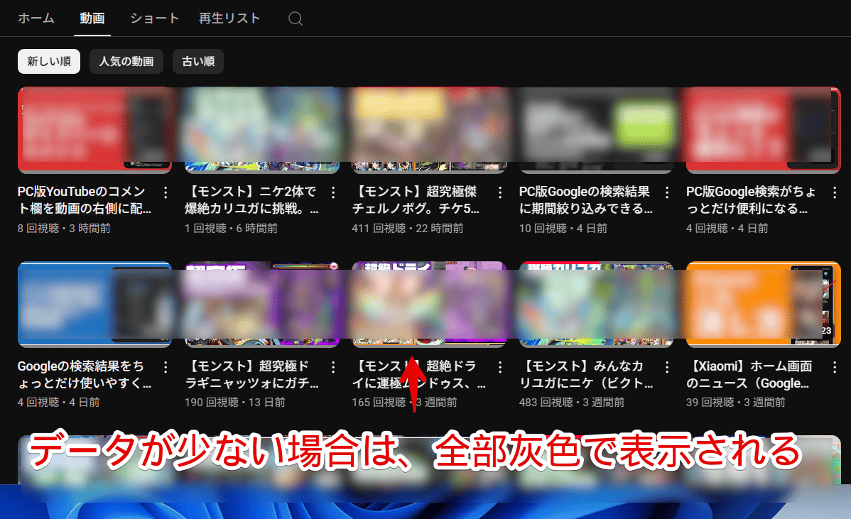 「Thumbnail Rating Bar for YouTube」拡張機能を使ってもデータが少ないせいで全部灰色で表示されている画像